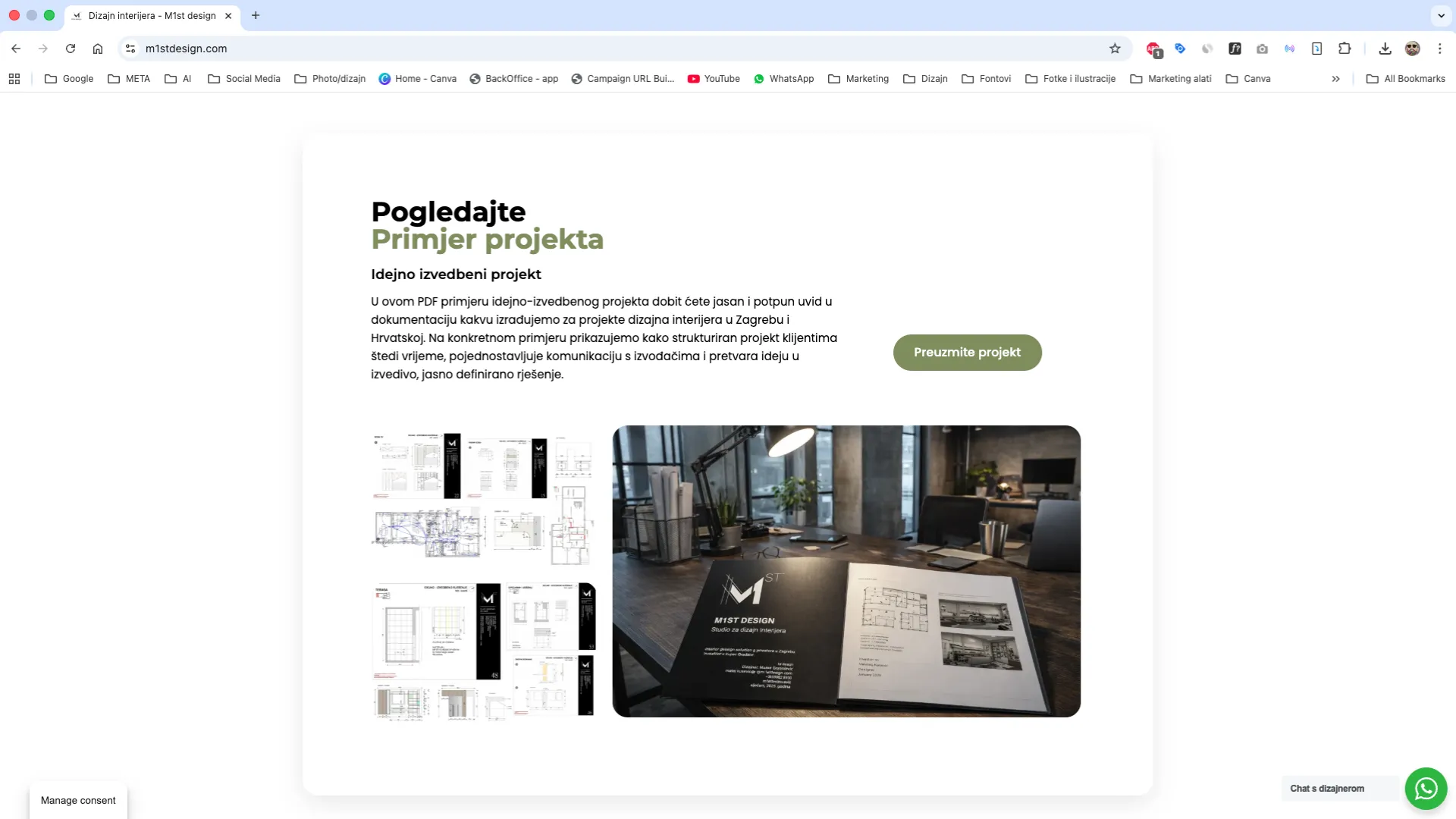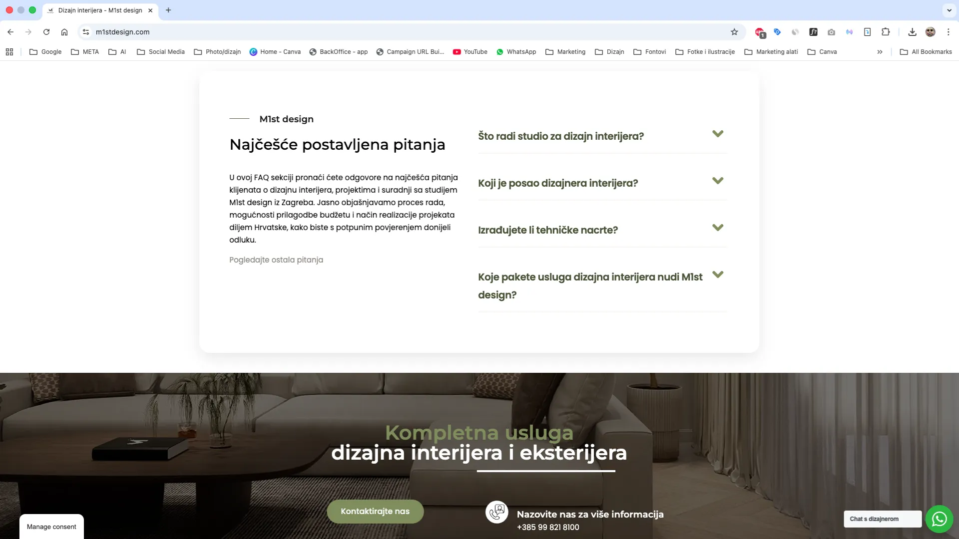 SEO i GEO optimizacija postavljeni su kao temelj strategije. Proveden je detaljan keyword research s fokusom na usluge i lokalni intent, optimizirana je struktura naslova i meta podataka, definirana jasna heading hijerarhija te implementirani strukturirani podaci (Schema). Lokalna optimizacija za Zagreb i šire područje dodatno je učvrstila pozicije u relevantnim pretragama. Paralelno su kontrolirani tehnički aspekti indeksacije – sitemap, canonical oznake i crawl struktura. Stranica je izgradila stabilne pozicije za relevantne pojmove u niši dizajna interijera i povećala autoritet domene kroz tematsku dosljednost i dubinu sadržaja.