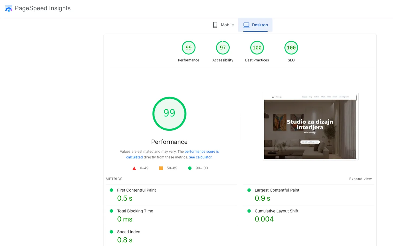 Tehnička optimizacija bila je jednako važna kao i sadržaj. Stranica je optimizirana do razine infrastrukture, s iznimno brzim učitavanjem, minimalnim pomicanjem elemenata i stabilnim korisničkim iskustvom. PageSpeed rezultati potvrđuju visoku razinu performansi, ali važnije od samih brojki jest činjenica da brzina i tehnička stabilnost izravno utječu na rangiranje i konverzije. Tehnička optimizacija nije dodatak — ona je konkurentska prednost.